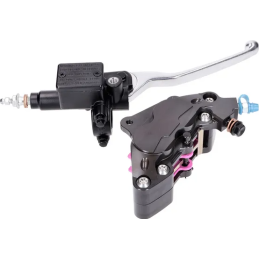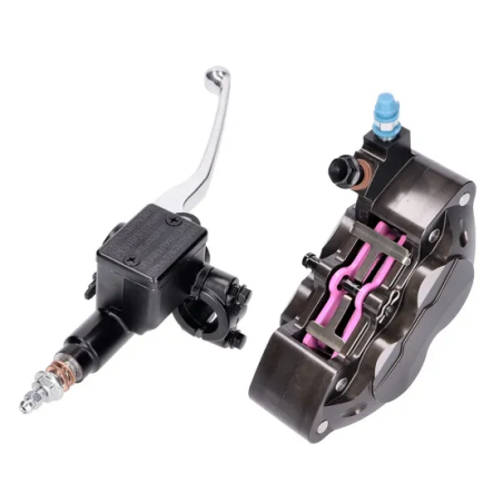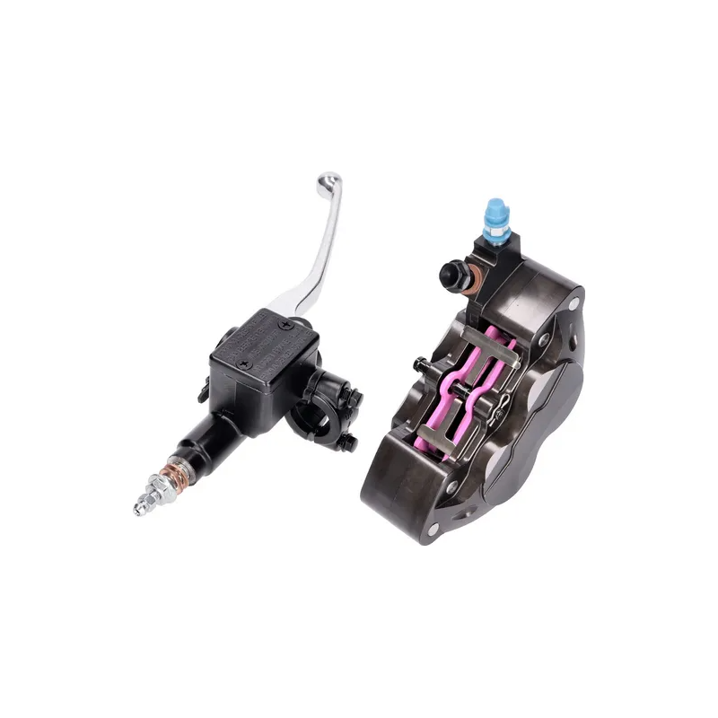 Complete front brake upgrade with CNC-machined 4-piston caliper and 16mm master cylinder. Fits many 50cc to 300cc Piaggio, Vespa, Gilera, Aprilia, and Derbi scooters. Better braking power, improved modulation, enhanced safety.