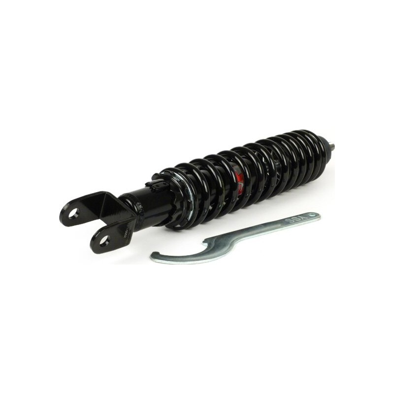 YSS Amortisseur qui va sur la Gilera Runner. La précharge du ressort peut être réglée à plusieurs niveaux avec la clé fournie. Série E. Longueur : 285 mm, couleur noire. Convient aussi à l'Piaggio, Zip, Skipper, Vespa LX, S et d'autres modèles 50-180 cm³ d'Piaggio, Vespa et Gilera.