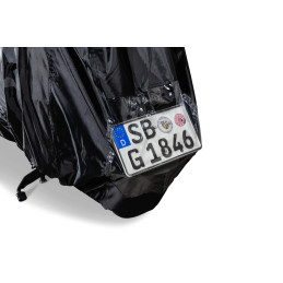 Housse de haute qualité pour moto ou scooter de la marque Stage 6. Parfaite si ta grosse machine reste longtemps dans le garage et que tu veux éviter qu'elle prenne la poussière, mais aussi pour b.v. la transporter sur une remorque ou la garer dans la rue (il y a même une pochette transparente pour la plaque d'immatriculation afin qu'elle reste bien lisible).