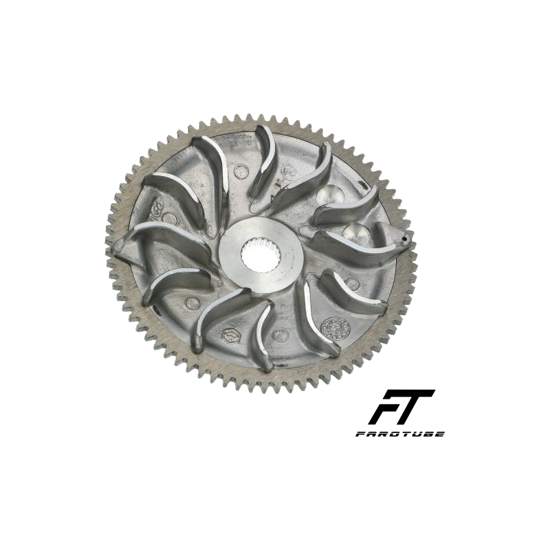 Couronne de démarrage spécialement usinée par Farotube (76 dents). La surface de roulement est tournée à un degré spécifique, ce qui garantit :✔ Une meilleure accélération✔ Plus d'espace pour les cales✔ La possibilité de monter une courroie trapézoïdale plus large (comme la courroie trapézoïdalePoliniou la courroie trapézoïdale Malossi)