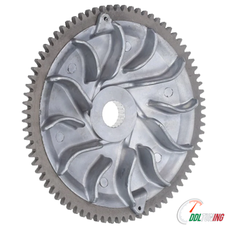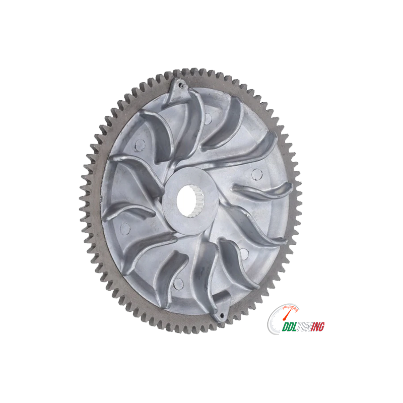 Couronne de démarrage spécialement usinée par DDL Tuning. (78 dents) La surface de roulement est usinée à un angle spécial. Ça donne une meilleure accélération, plus d'espace pour les cales et permet aussi de monter une courroie trapézoïdale plus large (courroie trapézoïdale o.a., Polini et Malossi).