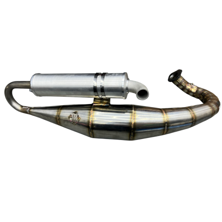 Échappement d'DDL Tuning pour les moteurs d'Piaggio, et Gilera 125/180cc. Cet échappement est un vrai monstre ! Il peut être monté sur des cylindres standard, mais aussi sur des cylindres modifiés ! Cet échappement est super performant à tous les niveaux ! Il est livré avec une bride d'échappement séparée, un support de suspension, un embout...