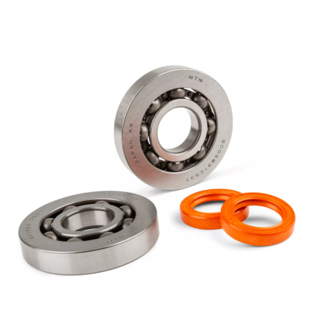 Kit de roulements de vilebrequin Stage6 R/T de haute qualité avec joints d'étanchéité FKM en orange. Avec des roulements NTN durables avec cage en acier, pour les moteurs 2 temps d'origine et modifiés d'Piaggio/Gilera de 125 à 180 cm³.