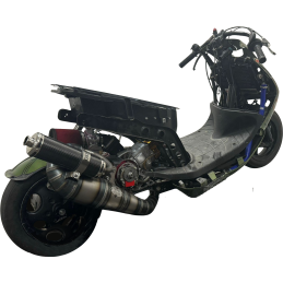 Échappement d'DDL Tuning pour les moteurs d'Piaggio, et Gilera 125/180cc. Cet échappement est conçu pour les vilebrequins 55 tours ! Il est livré avec une bride d'échappement séparée, un support de suspension, un embout interchangeable et un silencieux en aluminium de haute qualité de couleur noire.