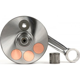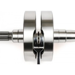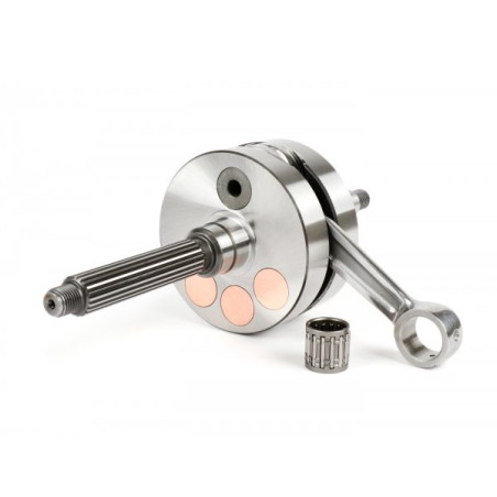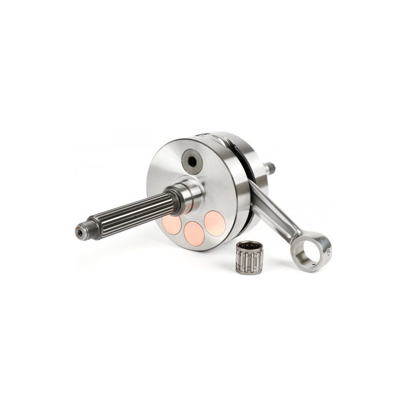 Les trous dans les joues du vilebrequin sont remplis de poids en cuivre et en aluminium, ce qui assure un équilibre parfait du vilebrequin. Comme ce vilebrequin est assez lourd et donc super bien équilibré, tu obtiens un moteur qui tourne super bien et en douceur. C'est super important pour l'Piaggio/Gilera Runner 125-180cc, car ils ont normalement déjà pas mal de vibrations.